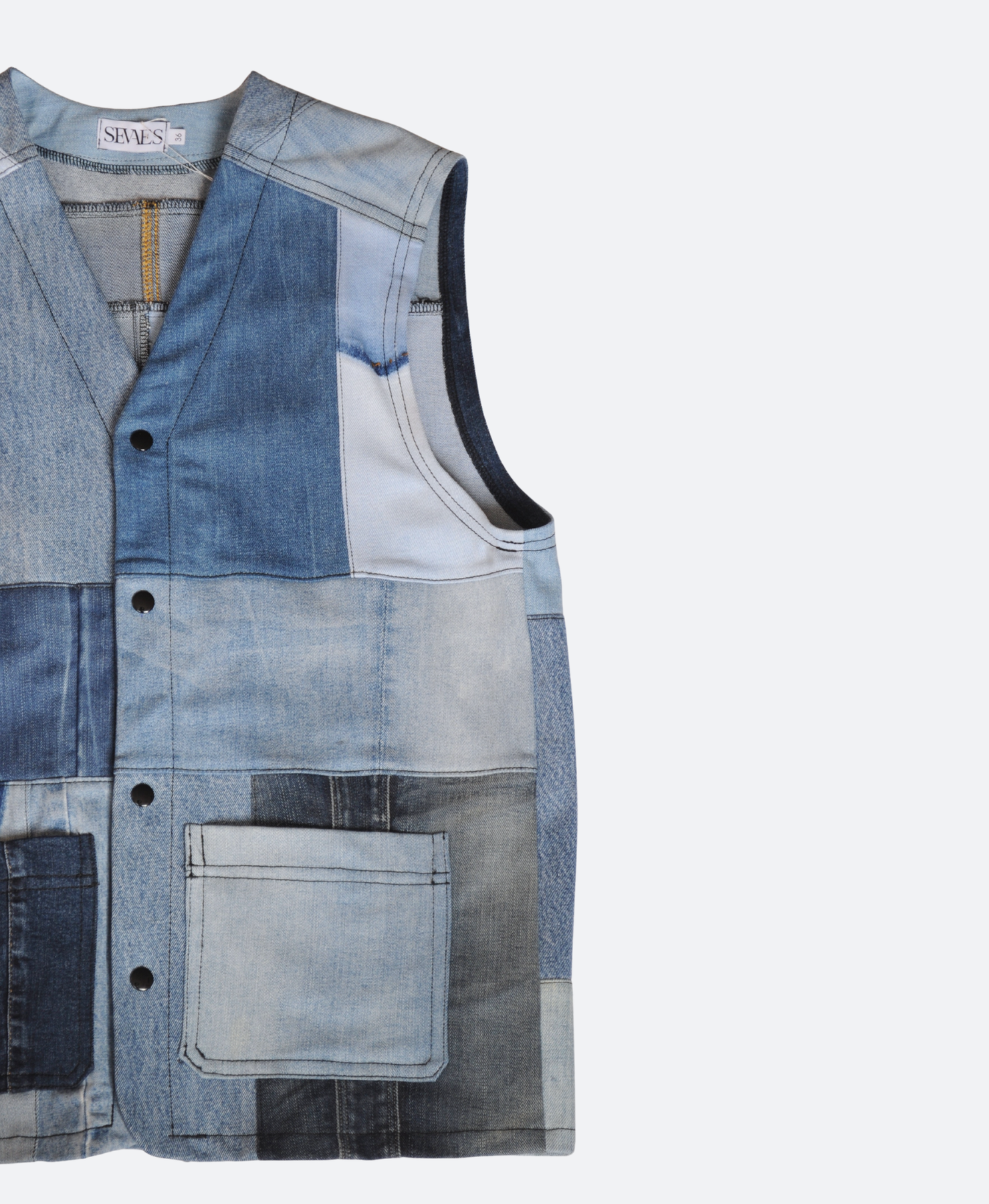 Maak je outfit af met onze patchwork utility vest van 100% upcycled denim. De bodywarmer heeft een uniek patchworkdesign in verschillende blauwtinten. Stoer, duurzaam en stijlvol in één.